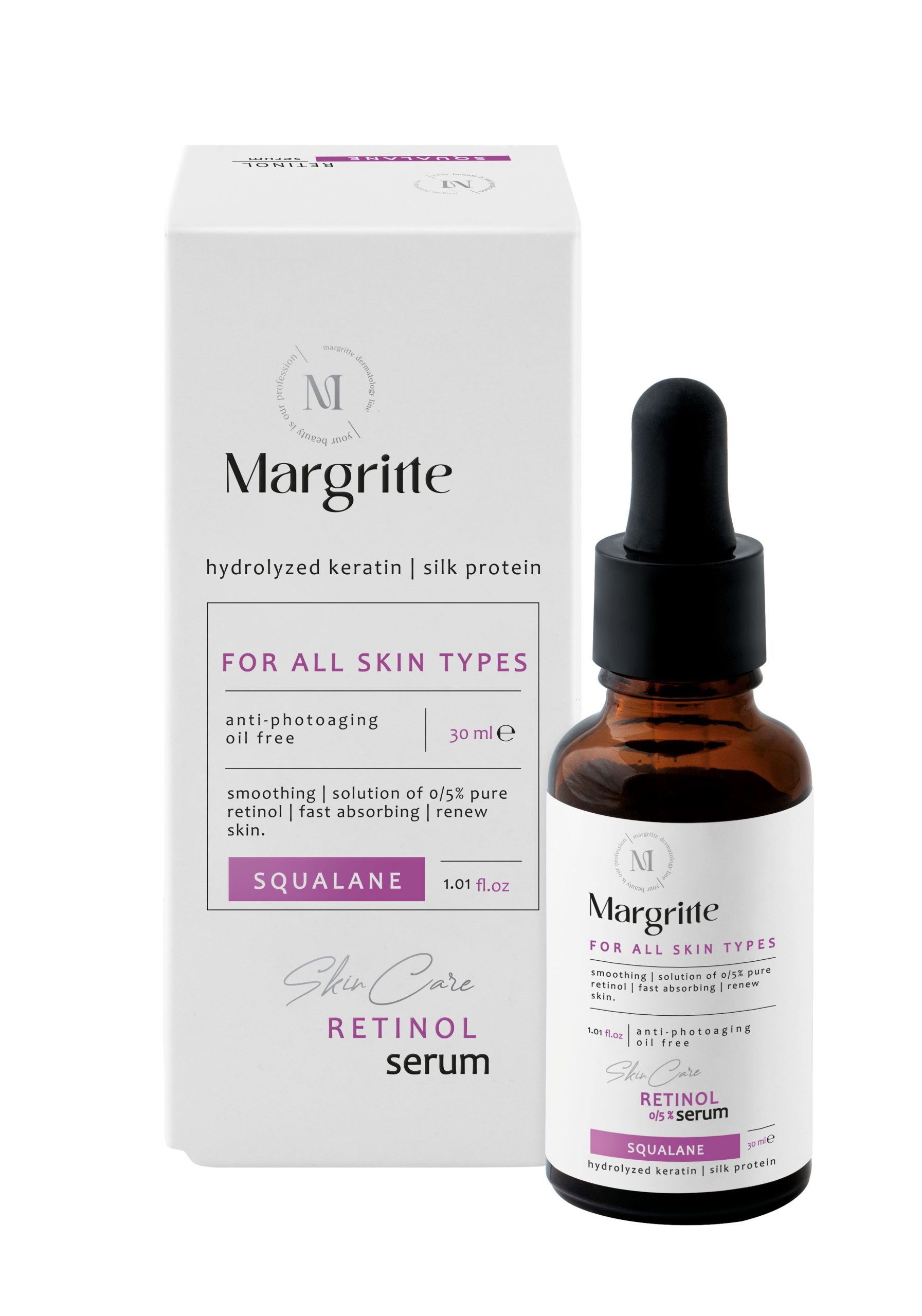 سرم رتینول مارگریت، راه حلی کارآمد برای جوانسازی و شادابی پوست nممانعت از کاهش خاصیت ارتجاعی پوست به کمک پالمیتوئیل تری پپتید-8 nتسکین قرمزی و کاهش التهاب های پوستی با بهکارگیری عصاره بید کانادایی nسرم رتینول مارگریت، دارای خاصیت لایه برداری بسیار ملایم nتسریع بازسازی سلولی و تحریک تولید کلاژن به واسطه داشتن رتینول nایدهآل برای انواع پوستnnاگر به دنبال محصولی هستید که پوست شما را شاداب تر و جوان تر کند، سرم رتینول مارگریت یکی از بهترین انتخاب ها است. این سرم فوق العاده به واسطه داشتن فرمولاسیون پیشرفته، پپتیدهای تقویت کننده و ترکیبات آبرسان قوی به کاهش علائم پیری، افزایش کلاژن سازی و شفافیت پوست کمک می کند. این محصول به طور تخصصی برای انواع پوست، حتی پوست های حساس، مناسب است و ضمن کاهش لک ها، چروک های ریز و تیرگی های پوست، زیبایی طبیعی پوست را بازیابی می کند nnرتینول، مشتقی از ویتامین A و یکی از موثرترین ترکیبات در مراقبت از پوست است. این ماده به تسریع بازسازی سلولی و تحریک تولید کلاژن کمک می کند و منجر به کاهش خطوط ریز و چروک ها می شود. همچنین در تنظیم ترشح چربی پوست و کاهش لک های ناشی از آفتاب اثر بسزایی دارد nnبه دلیل حساسیت زا بودن احتمالی، غلظت رتینول در سرم مارگریت بهگونه ای تنظیم شده است که مناسب استفاده برای انواع پوست باشد. استفاده تدریجی از این محصول و همراه با ضد آفتاب توصیه می شود. nnپالمیتوئیل تری پپتید-8 موجود در سرم رتینول مارگریت با تحریک تولید کلاژن و الاستین، به بازسازی بافت پوست کمک می کند. این پپتید همچنین با کاهش علائم پیری مانند افتادگی و کاهش خاصیت ارتجاعی پوست، ظاهری شاداب تر ایجاد می کند. nnعصاره بید کانادایی با خواص ضد التهابی و آنتی اکسیدانی خود به تسکین قرمزی و کاهش التهاب های پوستی کمک می کند. همچنین این ترکیب از آسیب های ناشی از استرس اکسیداتیو جلوگیری می کند. nnسرم رتینول مارگریت با ترکیبی از رتینول، پپتیدها و عصاره های طبیعی، محصولی ایده آل برای پیشگیری از چروک پوست صورت، افزایش شفافیت و بهبود خاصیت ارتجاعی پوست است. رعایت روش صحیح استفاده و محافظت از پوست در برابر نور خورشید، اثربخشی این محصول را به حداکثر می رساند. با استفاده مداوم از این سرم، زیبایی و جوانی پوست خود را به طور طبیعی حفظ کنید. nnnnمزایای سرم رتینول مارگریت nکارآمد در افزایش شفافیت و روشن تر شدن رنگ پوست و کاهش لک ها و تیرگی های ناشی از آفتاب nnکاهش خطوط ریز و چروک ها به واسطه داشتن ترکیبات موثر در بازسازی سلول های پوست nnبهبود خاصیت ارتجاعی و سفتی پوست با تحریک تولید کلاژن nnکاهش قرمزی و التهاب، به ویژه برای پوست های حساس nnدارای فرمولاسیونی ملایم و مناسب برای انواع پوست nnلیست ترکیبات سرم رتینول مارگریت nرتینول، پالمیتوئیل تری پپتید-8، آلانتوئین، زانتان گام، عصاره بید کانادایی، اسکوالان، بوتیلن گلایکول، پروتئین هیدرولیزشده ابریشم، توکوفریل استات، پروتئین هیدرولیزشده کراتین، گلیسیرین، اتیل الکل، دی سدیم ا.د.ت.آ، فنوکسی اتانول و اتیل هگزیل گلیسیرین، اسانس مجاز آرایشی، آب. nnnnطرز استفاده از سرم رتینول مارگریت nابتدا پوست صورت خود را با شونیده مناسب نظیر میسلار واتر 3 در 1 پوست خشک و حساس مارگریت تمیز کنید. سپس روزی 1 الی 2 بار چند قطره از سرم رتینول مارگریت را با کمک نوک انگشت روی پوست تمیز صورت و گردن پخش نمایید. برای دستیابی به نتیجه مطلوب حداقل 3 ماه استفاده شود. در هنگام مصرف رتینول استفاده روزانه از ضد آفتاب مناسب ضروری است. از مصرف پاک کننده های الکلی و اسکراب های خشن در زمان مصرف این محصول خودداری نمایید. nnاگر به دنبال داشتن پوستی شاداب، بدون چین و چروک و شفاف هستید و قصد دارید بیشتر درباره رتینول و تاثیرات شگفت انگیز آن بدانید، پیشنهاد می کنیم مقاله رتینول چیست و چه خواصی برای پوست دارد؟ تالیف کارشناس علمی داروکده را مطالعه کنید. این مطلب به زبان ساده و جامع توضیح می دهد که رتینول چیست،