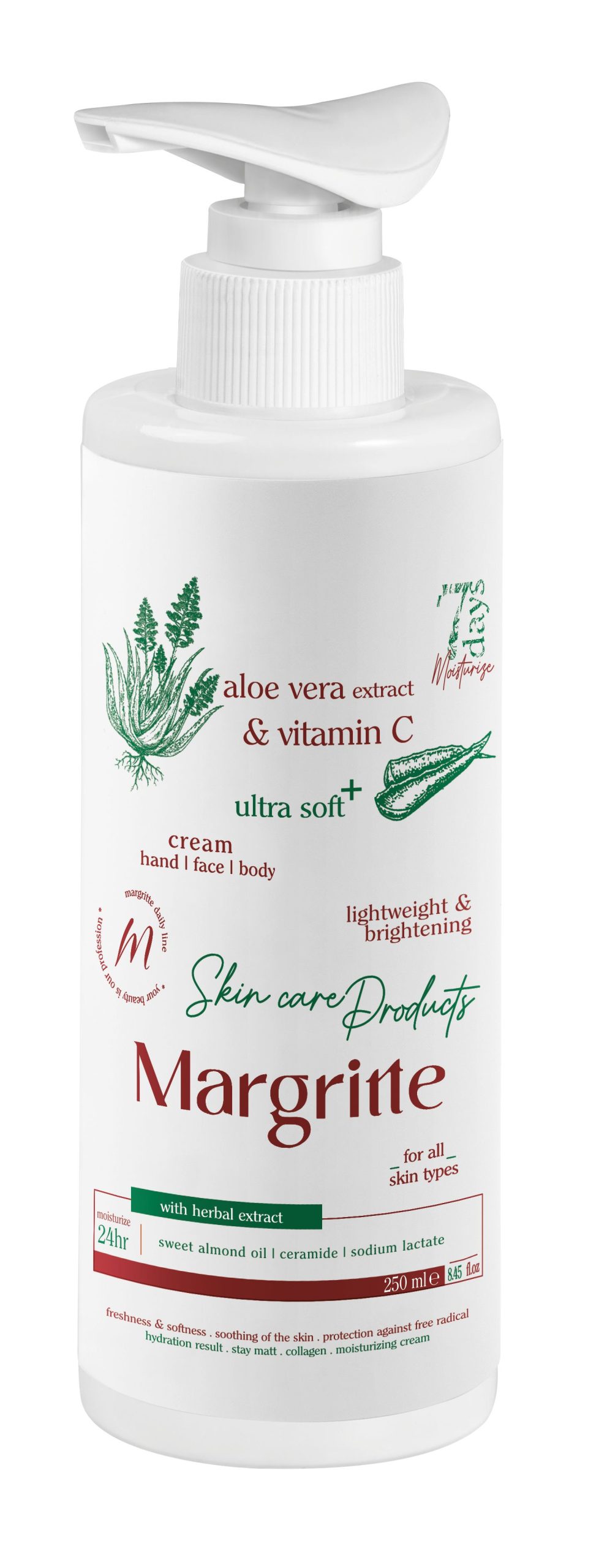 کرم مرطوب کننده و آبرسان آلوئه ورا مارگریت، مناسب انواع پوست nدارای خواص روشن کنندگی و درخشندگی به دلیل وجود ویتامین C nنرم کننده و ضد التهاب، حاوی گلیسیرین و عصاره آلوئه ورا nبا ماندگاری بالا و خواص رطوبت رسانی و تسکین دهندگی nتقویت استحکام و انعطاف پذیری پوست به کمک کلاژن nمحافظت کننده در برابر آلودگی و سایر عوامل مخرب محیطی nمرطوب کننده آلوئه ورا مارگریت با جذب سریع و بدون ایجاد حس چربیnnکرم مرطوب کننده و آبرسان آلوئه ورا مارگریت با فرمولاسیونی خاص و ماندگاری بالا، محصولی محافظتی جهت مراقبت از پوست دست، صورت و بدن است. این کرم با داشتن عصاره آلوئه ورا و ویتامین C، خاصیت روشنکنندگی و ترمیمکنندگی داشته و به حفظ شادابی و طراوت پوست در طول روز کمک میکند. nnویژگی برجسته مرطوب کننده آلوئه ورا مارگریت، جذب سریع آن است که بدون ایجاد حس چربی اضافی، رطوبت مورد نیاز پوست را تأمین میکند. خاصیت محافظتی آن در برابر عوامل مخرب محیطی مانند آلودگی هوا و خشکی، از پوست شما در برابر آسیبهای احتمالی مراقبت کرده و آن را نرم و سالم نگه میدارد. nnکرم آلوئه ورا مارگریت همچنین خاصیت جوان کنندگی دارد و برای انواع پوست، از جمله پوستهای خشک و حساس نیز مناسب است. این محصول به طور ویژه برای حفظ رطوبت، تقویت پوست و ایجاد لطافت طراحی شده است. با استفاده منظم از این کرم، پوستی شاداب، نرم و انعطافپذیر خواهید داشت. nnترکیبات کلیدی مرطوب کننده انواع پوست مارگریت شامل آلوئه ورا و ویتامین C است. آلوئه ورا به عنوان یک آبرسان طبیعی شناخته میشود و در تسکین التهابات، حفظ و تأمین رطوبت پوست نقش بسزایی دارد. همچنین حضور ویتامین C، باعث روشن تر شدن، کاهش تیرگی و افزایش درخشندگی پوست می شود. کرم آلوئه ورا مارگریت با ویژگیهای منحصر به فرد خود، انتخابی مناسب برای مراقبت روزانه پوست و حفظ سلامت آن است.nnمزایای کرم مرطوب کننده آلانتوئین و آووکادو مارگریت nجوانکننده، تأمین کننده رطوبت و ایجاد حس شادابی در پوست nمراقبت از پوست در برابر عوامل مخرب محیطی nمناسب برای انواع پوست دست، صورت و بدن nبا جذب سریع بدون ایجاد حس چربی اضافی nروشن کننده و کاهش دهنده تیرگی پوست nبا ماندگاری بالا جهت حفظ طراوت پوست nnnترکیبات کرم مرطوب کننده آووکادو مارگریت nآب دیونیزه، اسید استئاریک، گلیسیرین منو استئارات، سدیم پی سی ای، روغن بادام شیرین، سدیم لاکتات، کلاژن، پروپیلن گلیکول، تری اتانول آمین، PEG-7 گلیسیرین کوکوات، گلیسیرین، سدیم اسکوربیل فسفات (فرم پایدار و محلول در آب ویتامین C)، صمغ زانتان، سیکلومتیکون، دی سدیم ادتا، سرامید، کربومر، اوره، پارافین، دایمتیکون، عصاره آلوئه ورا، وازلین، متیل پارابن، پروپیل پارابن، اسانس مجاز آرایشی. nnnnروش استفاده از کرم مرطوب کننده آلانتوئین و آووکادو مارگریت nابتدا با استفاده از یک پاک کننده مناسب، پوست دست، صورت و بدن خود را تمیز کنید. nسپس، مقدار کافی از کرم مرطوب کننده مارگریت را با ملایمت روی پوست ماساژ دهید تا کاملا جذب شود. nبسته به نیاز پوست، می توانید چند بار در روز از این محصول استفاده نمایید. nnnعوارض و نکات ضروری در مصرف کرم مرطوب کننده آووکادو مارگریت nاز تماس محصول با چشم خودداری نموده و در صورت تماس، چشم ها را با آب فراوان بشویید. nکرم مرطوب کننده آلوئه ورا مارگریت فقط برای استعمال خارجی است. nمحصول را دور از دسترس کودکان و نور مستقیم آفتاب نگهداری کنید. nnپوست دور چشم به دلیل نازکی و حساسیت بالا، نیازمند مراقبت ویژه و استفاده از محصولات سبک و ملایم است؛ بنابراین نمی توان از مرطوب کننده های صورت برای زیر چشم استفاده کرد، مگر اینکه در توضیحات خود محصول ذکر شده باشد. nnکرم مرطوب کننده دور چشم باید به گونه ای باشد که به حفظ رطوبت و کاهش خشکی کمک کرده و همچنین، از ایجاد چین و چروک جلوگیری کند. برای کسب اطلاعات بیشتر از نحوه انتخاب مرطوب کننده دور چشم، مقاله “بهترین کرم مرطوب کننده دور چشم” تألیف کارشناس علمی د